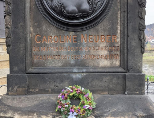 Anlässlich des Todestages der Neuberin legte Klaus Voigt vom Förderverein mit seiner Frau am 1.12.2020 einen Kranz am Neuberin-Denkmal