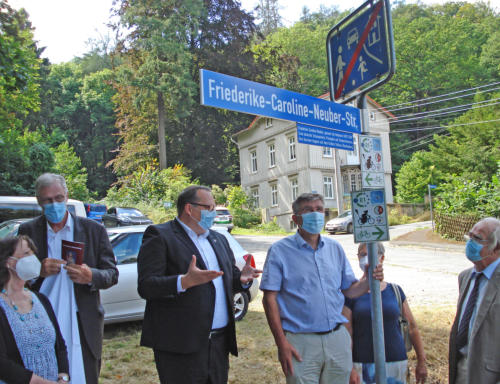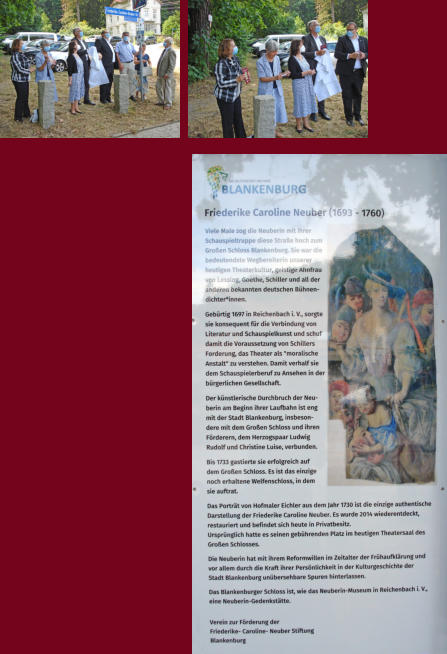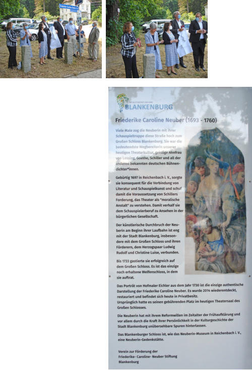 12.08.2021 Eine Straße für die NeuberinWer vom Schieferberg zum Großen Schloss Blankenburg hinaufwandert, ist seit Donnerstag auf der Friederike-Caroline-Neuber-Straße unterwegs.Die Umbenennung wurde von der Stiftung beim Stadtrat beantragt und ist dort als genehmigt beschlossen worden.