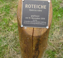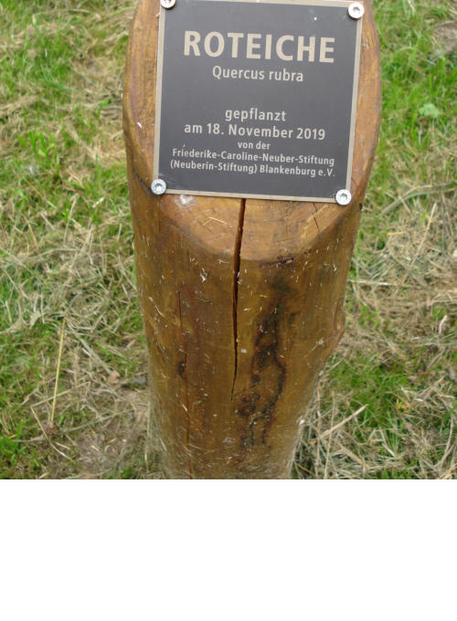 Eiche am Schloßteich - SignierungDie Eiche wurde, weil ein Symbol für Langlebigkeit, für die Neuberin gewählt und ist von der Stiftung gespendet worden.